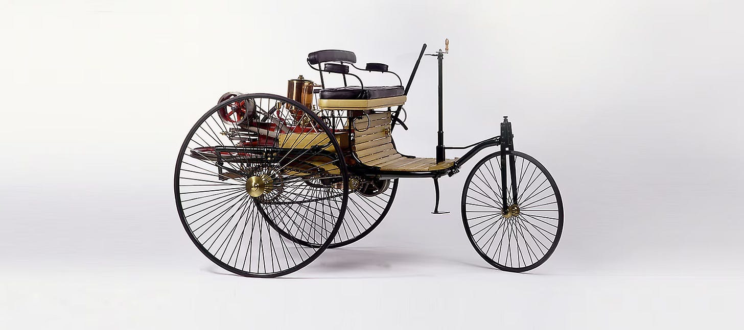 When cars first appeared, they were literally called “horseless carriages”, and they looked exactly like carriages. The driver sat up high on a bench, there was no windshield, and the steering mechanism resembled reins. It took two decades before someone thought to lower the body, enclose it, and put the engine where the horse used to be.